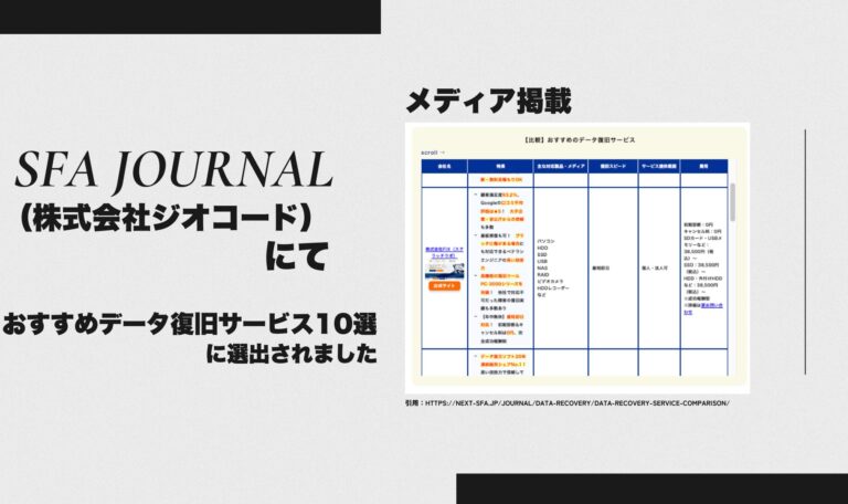 この度、秋葉原データ復旧スクラッチラボは、株式会社ジオコードが運営するビジネス情報メディア「SFA JOURNAL」において、信頼できるデータ復旧サービス提供企業として選出・掲載されましたことをご報告いたします。